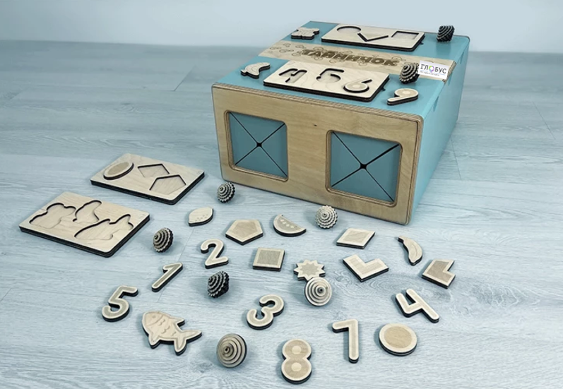 Тактильный развивающий комплект «Тайничок» состоит из закрытого ящичка с делениями и углублениями для рук, набора дидактических пластин с различными фигурками, местом для хранения пластин и короба для хранения фигурок. Данная конструкция позволяет проводить занятие одновременно с двумя детьми.