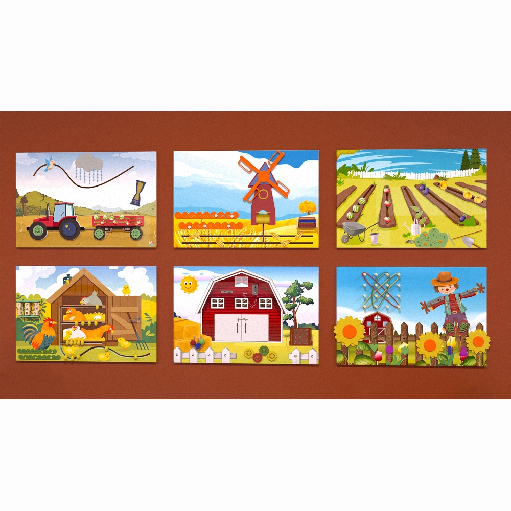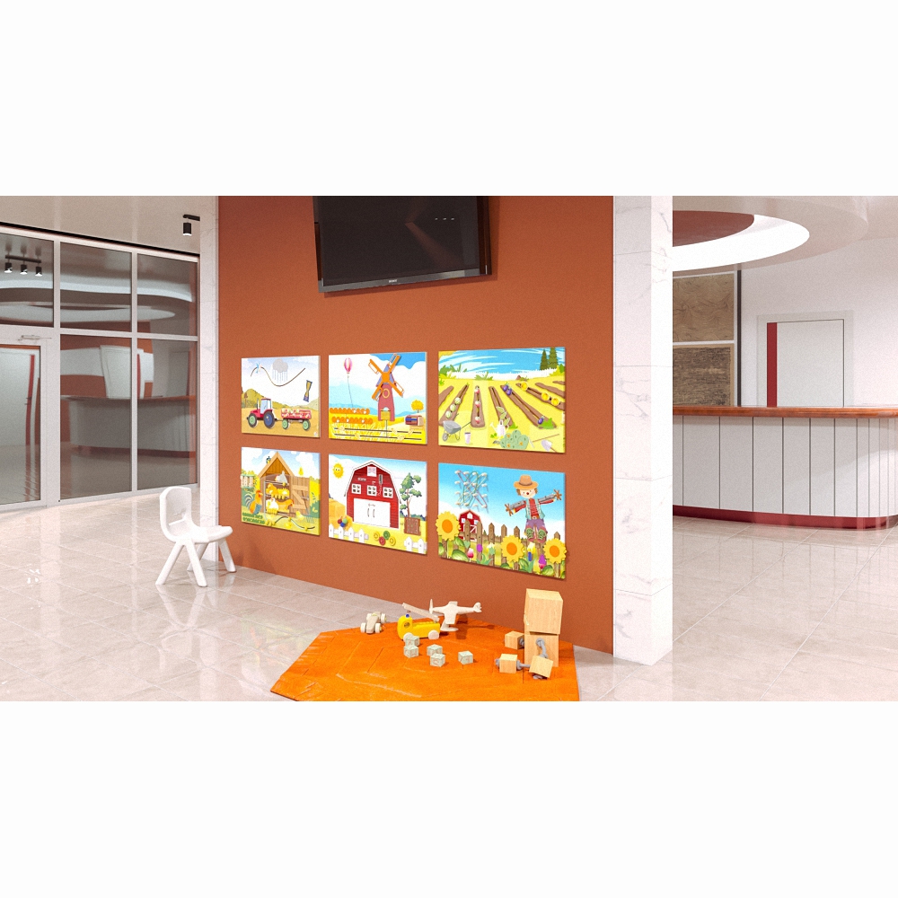 Комплект настенных панелей «Ферма» состоит из 6 частей прямоугольной формы, которые выполнены в одном размере и оформлены в единой цветовой гамме. На каждой панели изображены разные части домашнего фермерского хозяйства. Безопасно крепятся к стене, покрытие панелей наивысшего качества обеспечит безопасность при игре.